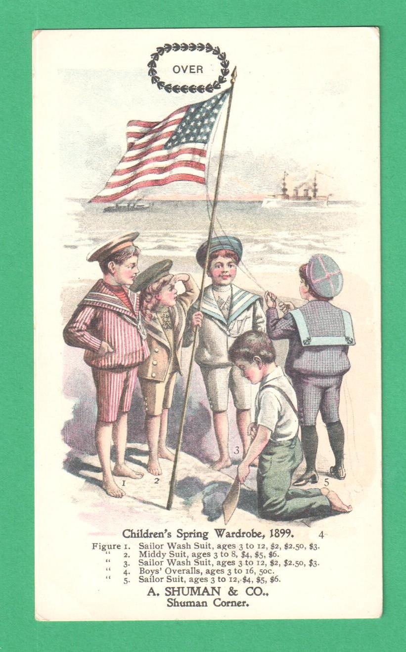 Title (ebay affiliate link): 1899 TRADE CARD SHUMAN CO., BOSTON CHILDREN''S SPRING CLOTHES SAILOR SUITS BEACH