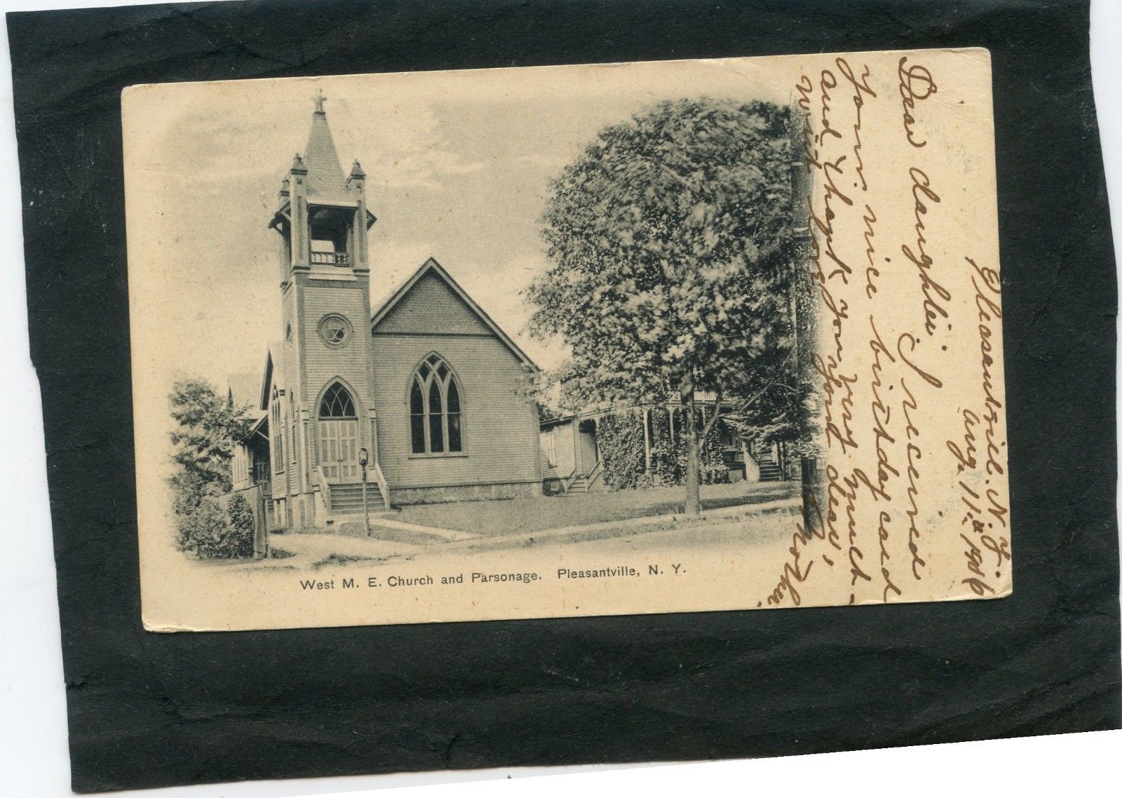 Title (ebay affiliate link): Pleasantville New York, vintage 1906 b&w postcard, West M.E. Church & Parsonage