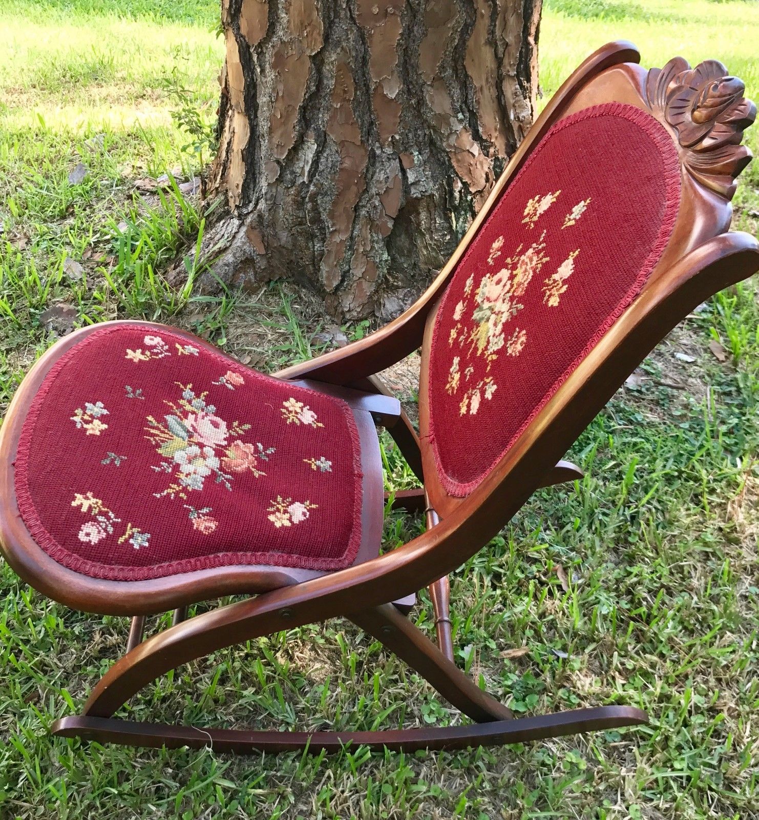 Title (ebay affiliate link): Antique Vintage Victorian Folding Red Tapestry Padded Seat/Back Rocking Chair