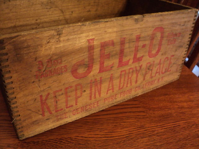 JELL-O VINTAGE WOOD DOVETAIL ADVERTISING CRATE BOX WITH RED LETTERING PRINT