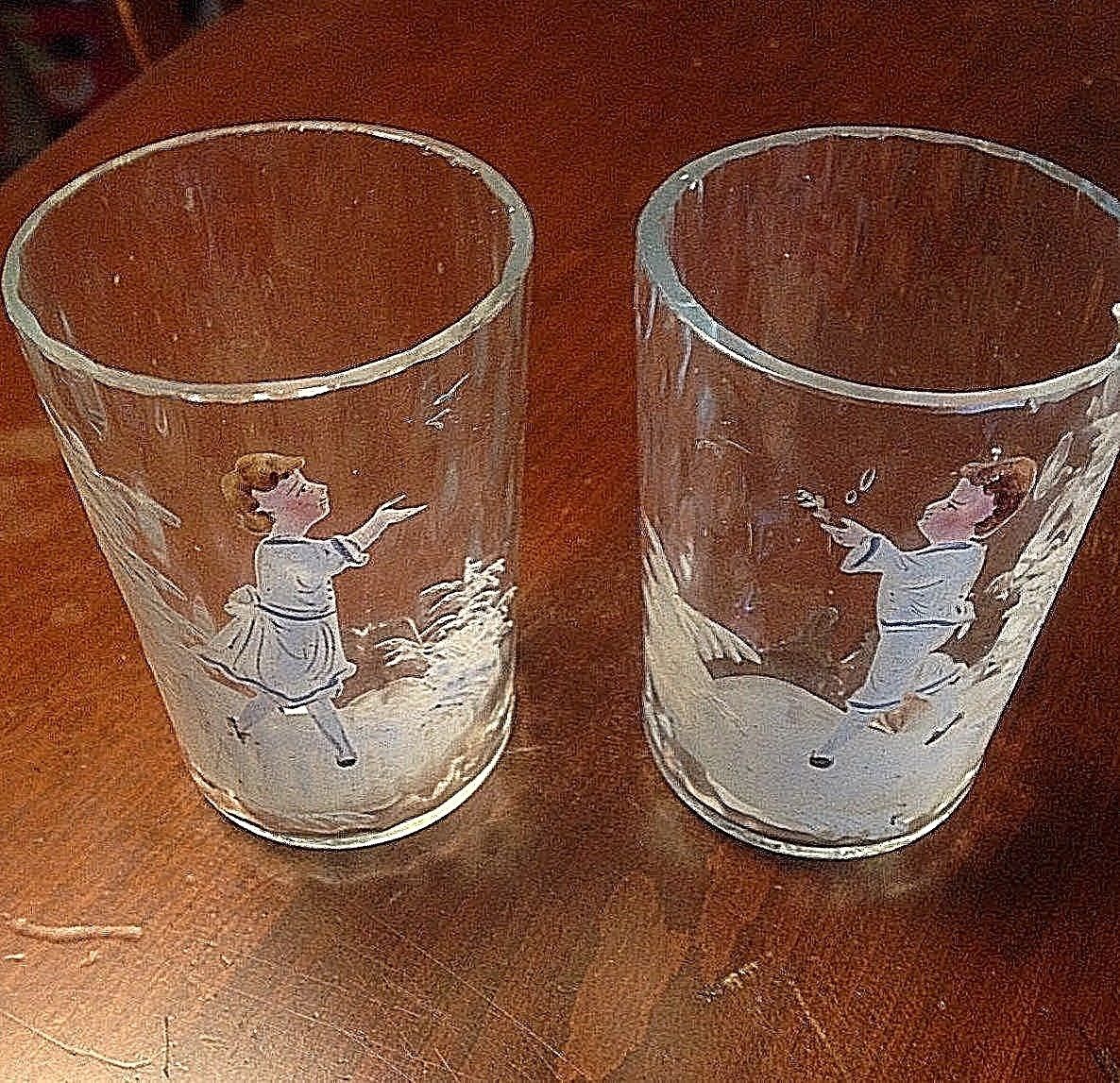 Title (ebay affiliate link): PAIR OF MARY GREGORY CLEAR GLASS TUMBLER 3.75 IN VERY NICE CONDITION