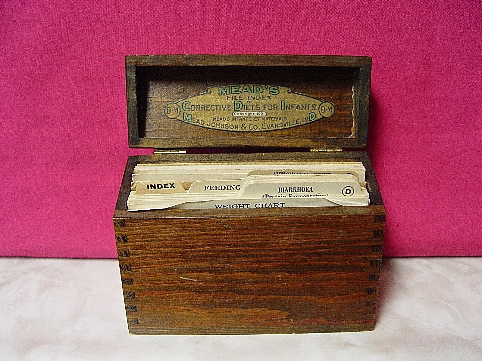 Title (ebay affiliate link): VINTAGE 1921 WOODEN BOX MEADS FILE INDEX CORRECTIVE DIETS FOR INFANTS BABY