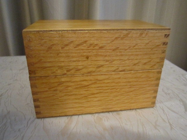 Title (ebay affiliate link): Vintage Maple or Oak Dovetail Joint INDEX CARD 3x5 Recipe File Box metal hinges