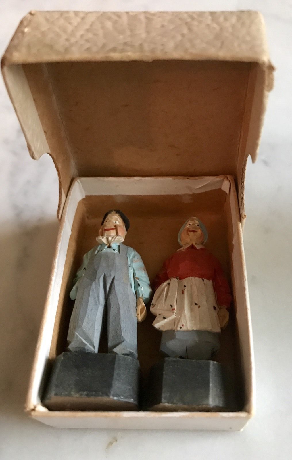 Title (ebay affiliate link): Antique Carved Miniature Figures Quebec Man & Woman in Original Box!