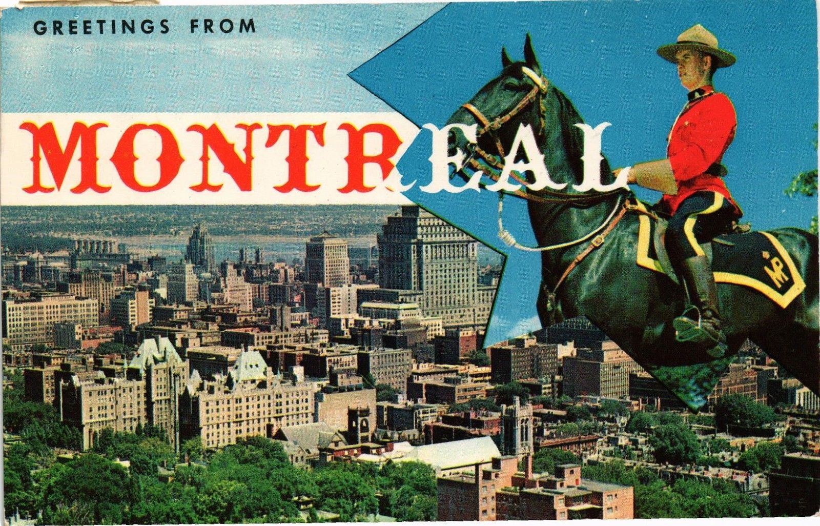 DR JIM STAMPS POSTCARD MONTREAL BUSINESS DISTRICT AND ROYAL MOUNTED POLICE 1957