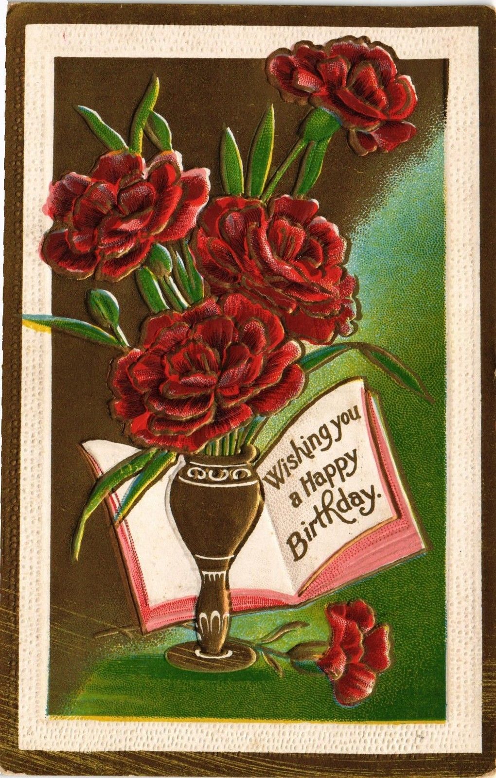 DR JIM STAMPS US POSTCARD HAPPY BIRTHDAY GOLD ACCENT RED CARNATIONS IN VASE