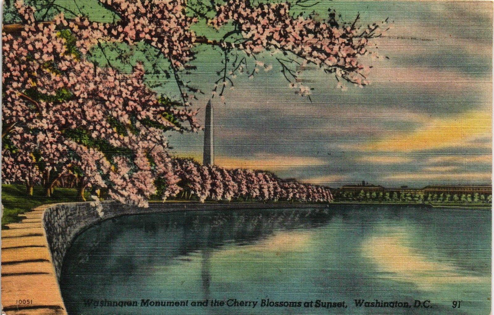 Title (ebay affiliate link): DR JIM STAMPS US POSTCARD WASHINGTON MONUMENT CHERRY BLOSSOMS 1947