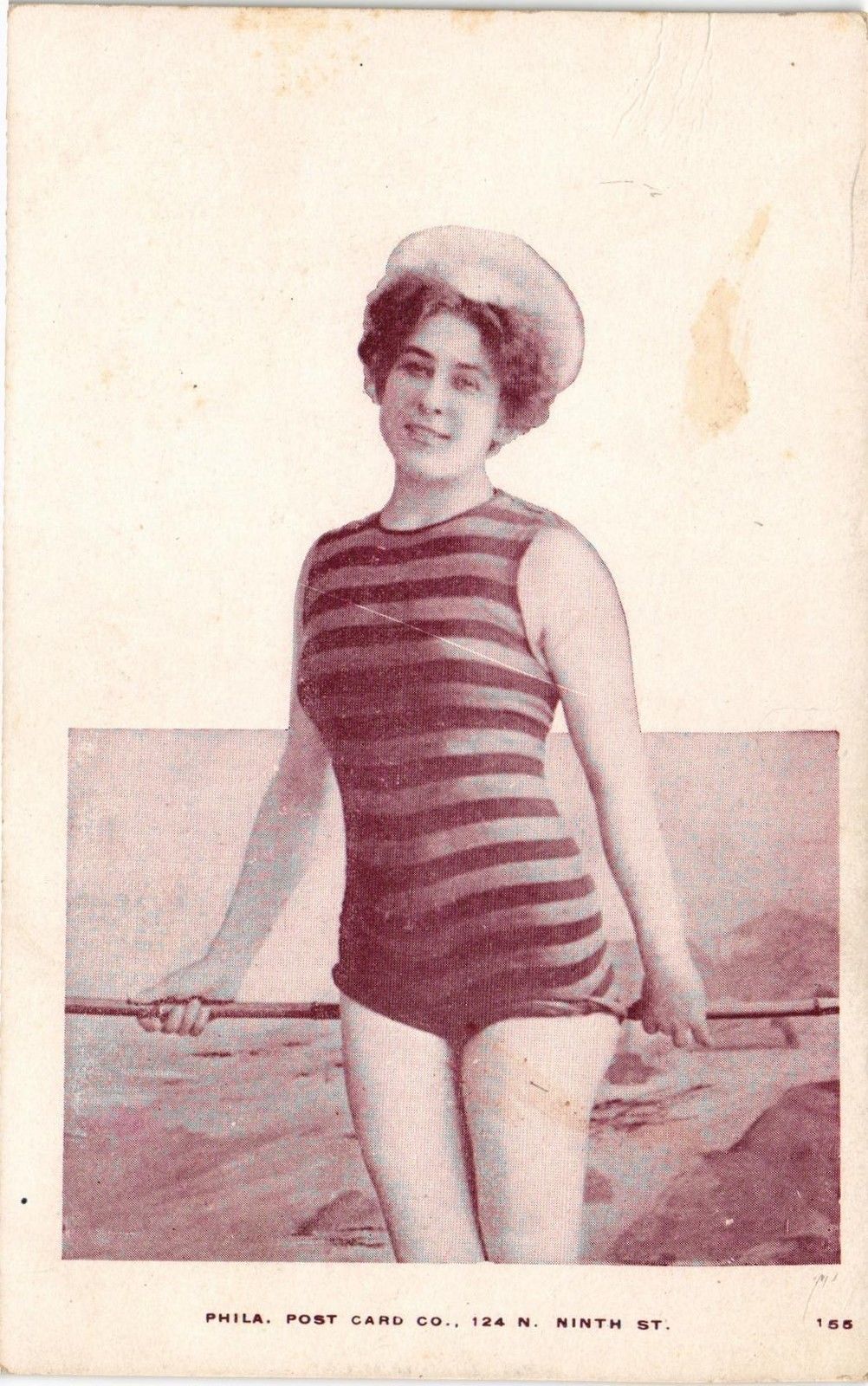 DR JIM STAMPS US POSTCARD PICTURE OF WOMAN IN OLD TIME BATHING SUIT AND HAT
