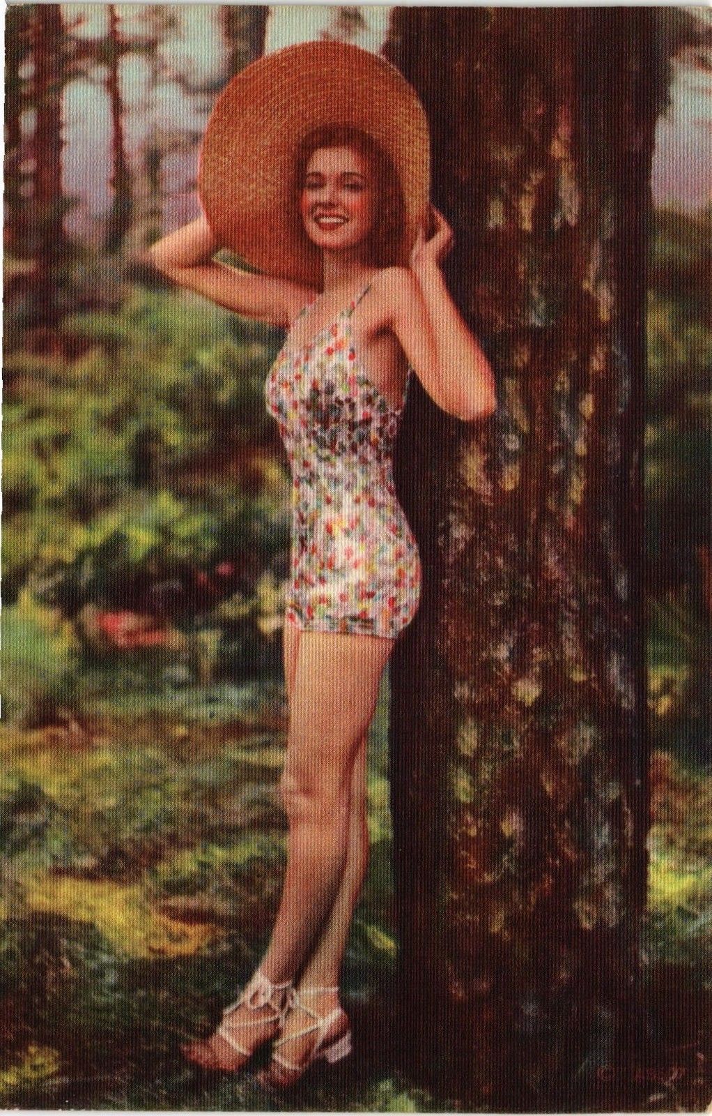 Title (ebay affiliate link): DR JIM STAMPS US POSTCARD LINEN LADY IN BATHING SUIT WEARING BIG HAT BY TREE