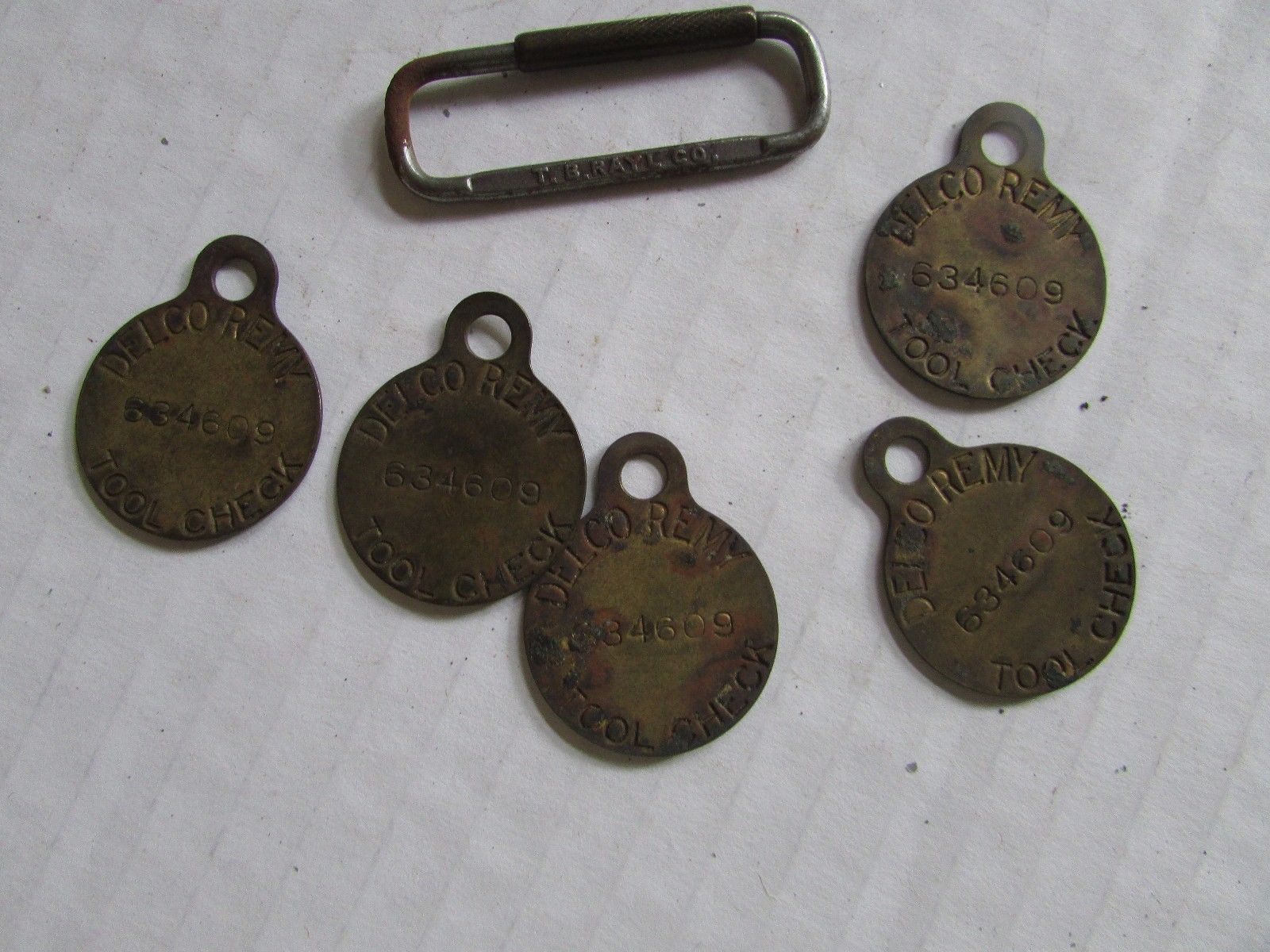Title (ebay affiliate link): Vintage Lot Of 5 Delco-Remy Employee Brass Tool Check Tags +Tag Holder