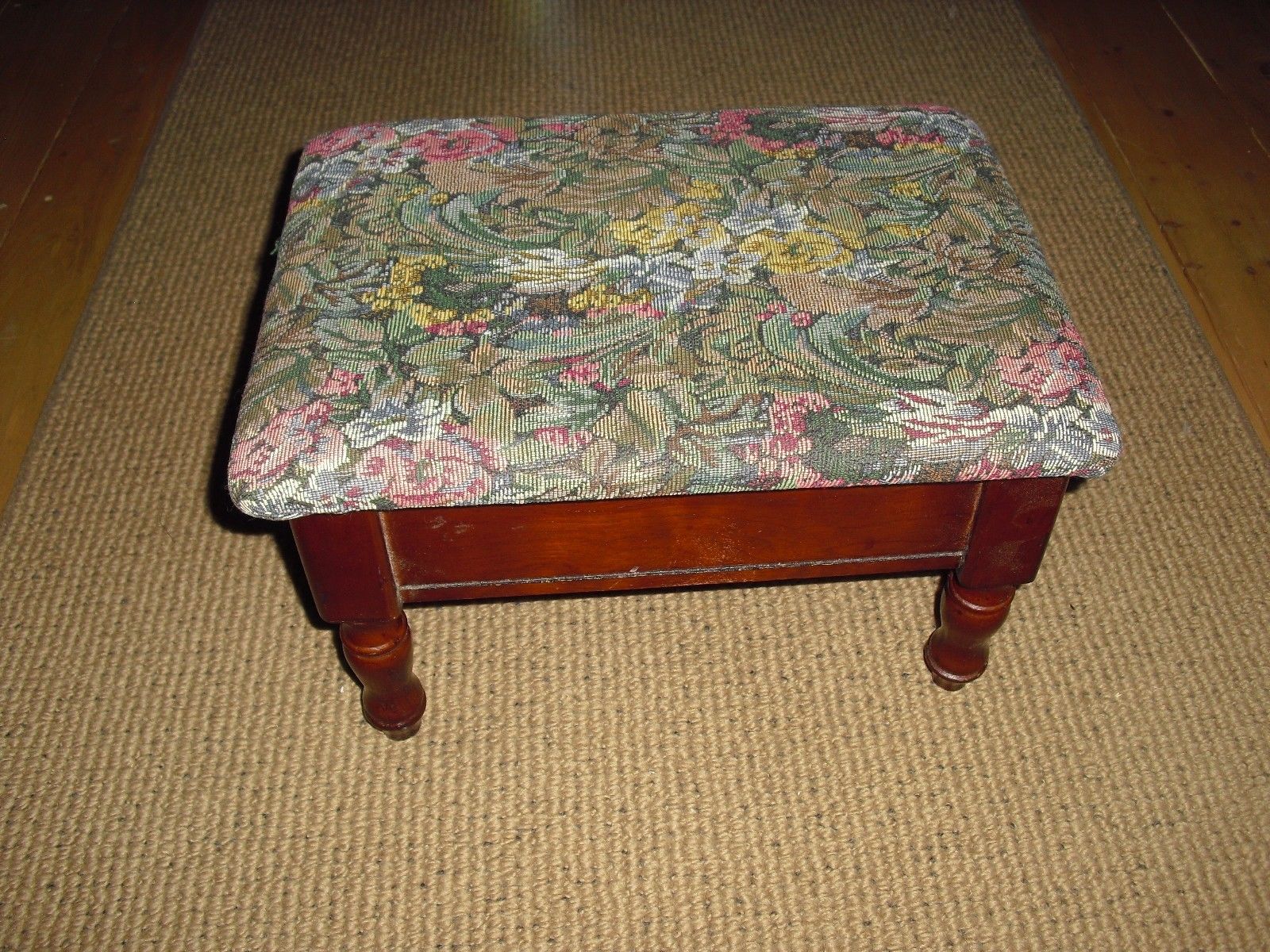 Title (ebay affiliate link): Vintage Wood Foot Stool Sewing Box Ottoman Embroidered Top