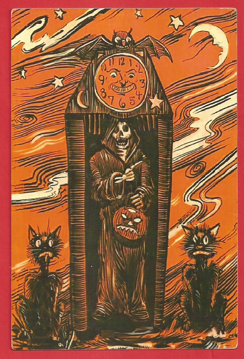 Halloween, Clock Skeleton, Black Cats, Pumpkin, Bat, Scary Postcard