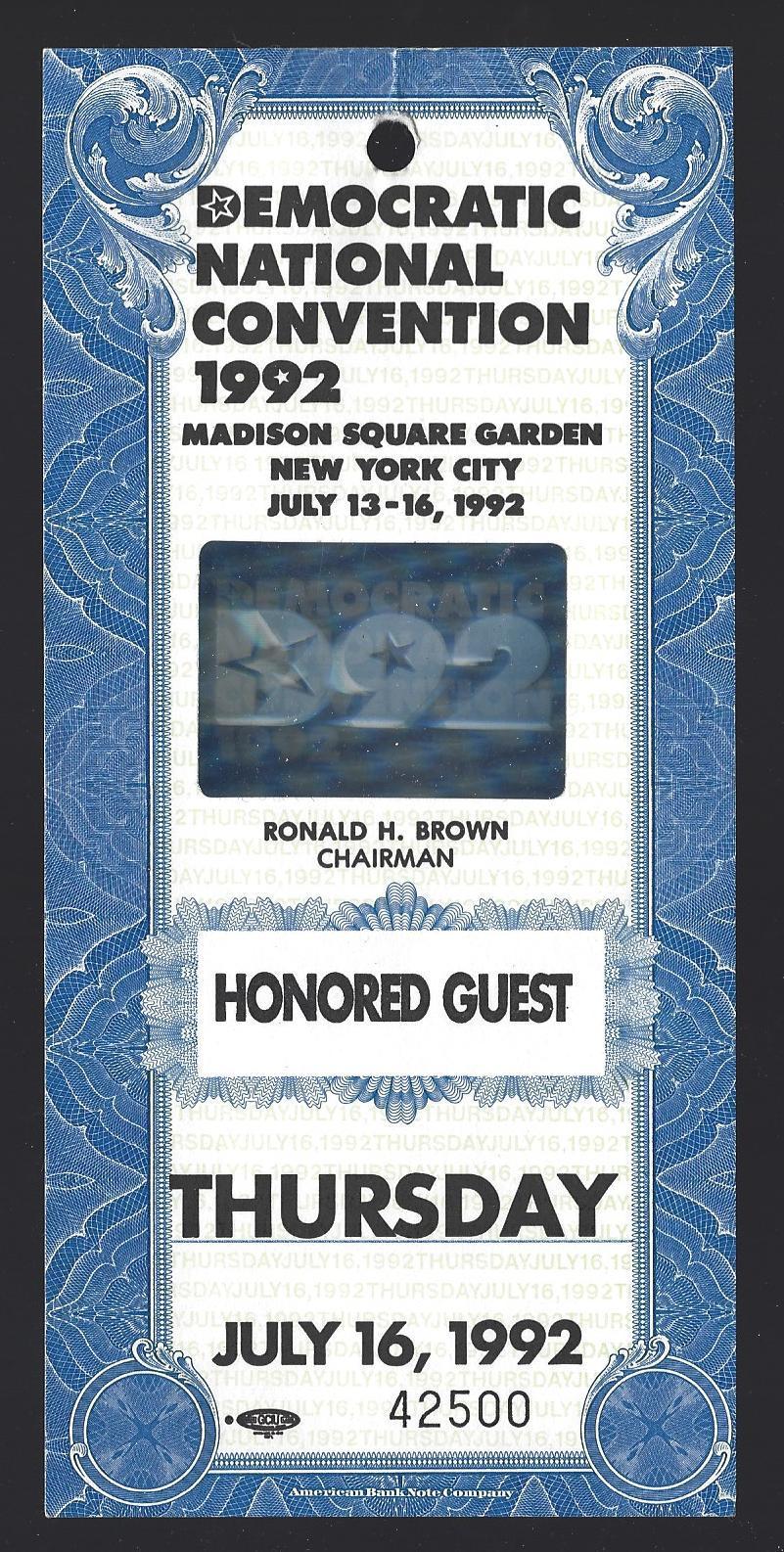 1992 DEMOCRATIC NATIONAL CONVENTION OFFICIAL TICKET - BILL CLINTON