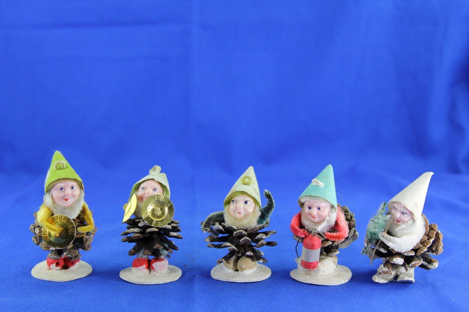 Title (ebay affiliate link): FIVE VINTAGE JAPANESE PINE CONE CHRISTMAS ELVES PLASTIC FACES PAPER HATS