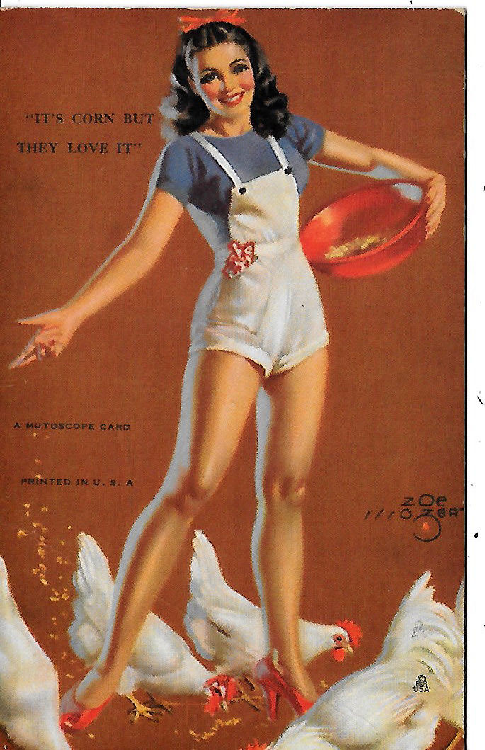Title (ebay affiliate link): RISQUE MUTOSCOPE CARD: VERY SEXY BRUNETTE WEARS SHORT OVERALLS & FEEDS CHICKENS