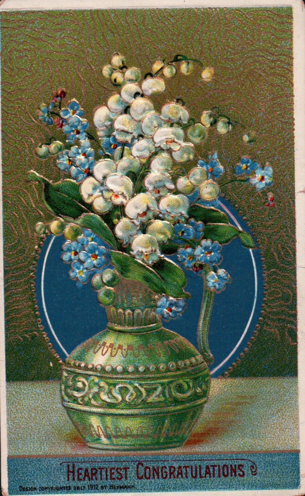 1912 Heymann LILIES OF THE VALLEY & F-M-Nots in Green Vase Vintage Postcard
