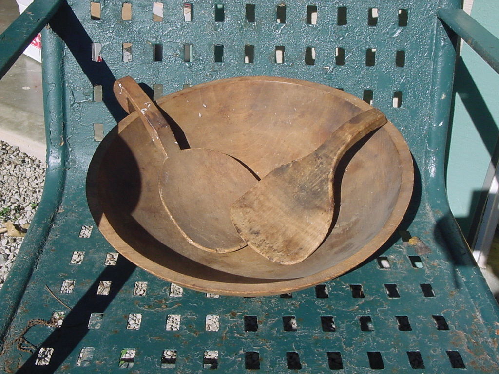 antique hand turned old wooden butter bowl 13" and hand carved butter paddles