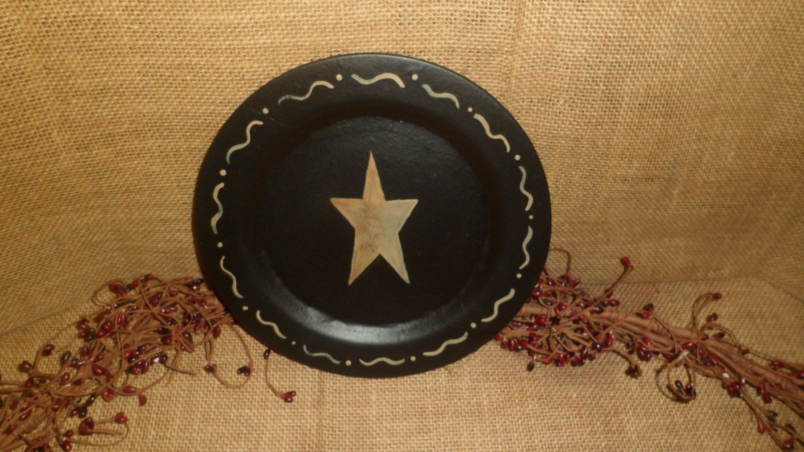 Title (ebay affiliate link): PRIMITIVE TIN 9" PLATE BLACK TAN STAR COLONIAL COUNTRY FARMHOUSE HOME DECOR
