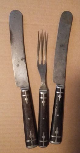 Title (ebay affiliate link): 3 Pc Civil War Era Flatware Wood Handle w/Pewter Inlay 2 Knives & 3 Prong Fork