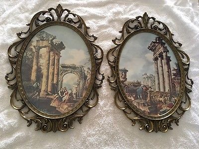 Vintage Rare Unique Ornate Metal Framed Oval Pictures Made In Italy