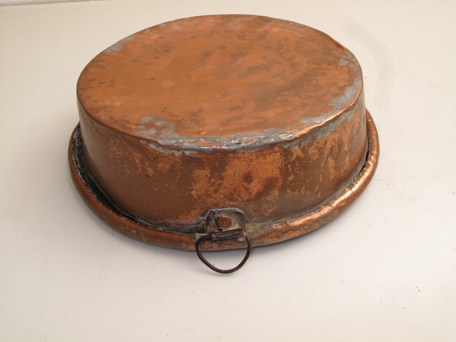 Title (ebay affiliate link): ANTIQUE DOEVTAILED COPPER CAKE PAN TIN ROLLED EDGE CRUDE DEEP DISH PIE PLATE