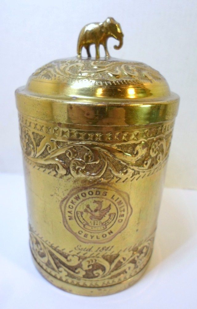 Title (ebay affiliate link): Antique MACKWOODS LIMITED CEYLON TEA CADDY Stamped Brass ELEPHANT Knob 5" Tall