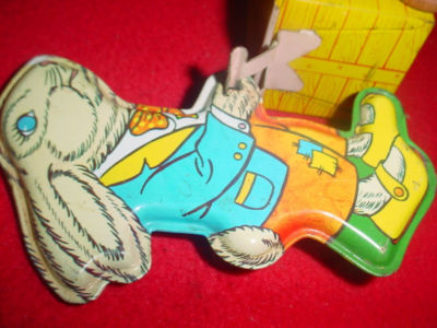 OHIO ART TIN TOY RABBIT WITH CART- WOOD WHEELS