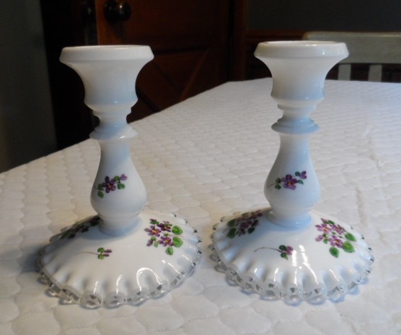 Title (ebay affiliate link): 2 Fenton Milk Glass Silver Crest Spanish Lace Violets in the Snow Candle Holders