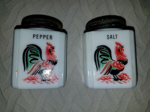 Title (ebay affiliate link): Vintage 1930s 1940s Milk Glass Salt and Pepper Shakers with Rooster Design