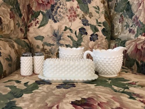 Title (ebay affiliate link): Fenton Milk Glass Hobnail Butter Dish/ Sugar And Creamer/ Salt And Pepper Shaker