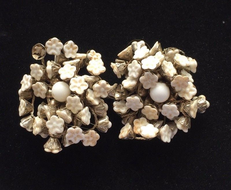 Title (ebay affiliate link): Vtg ANTIQUE Art Deco or Victorian Earrings White Milk Glass Flower Clipon