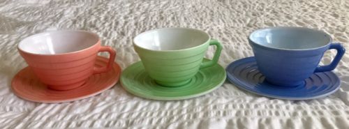 Vintage Pink Blue & Green Milk Glass Cups & Saucers