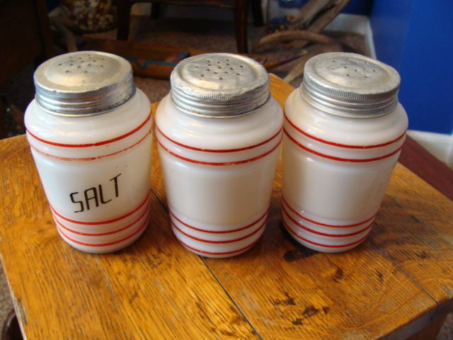 Title (ebay affiliate link): 3 pc DECO MILK GLASS SALT AND PEPPER SHAKERS With Black Letters an Red Stripe