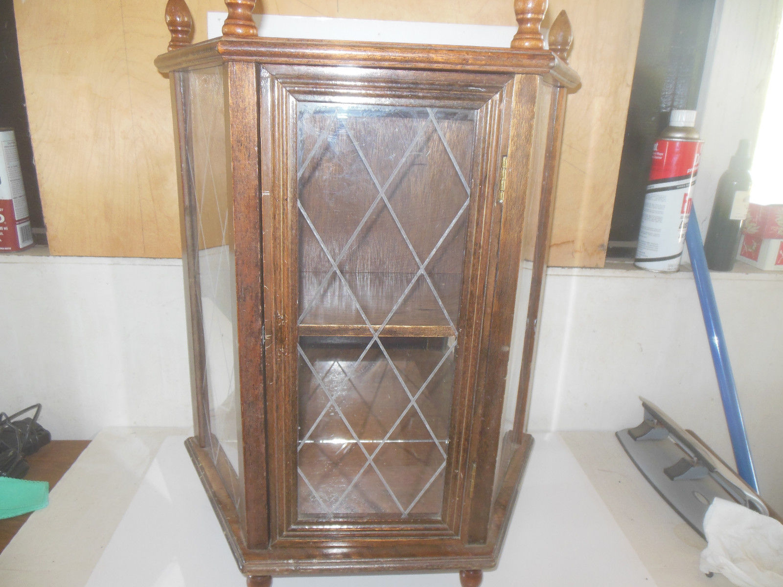 Title (ebay affiliate link): Vintage Wall Mount Curio Cabinet w/diamond glass 24"x18"x9"