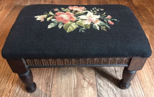 Title (ebay affiliate link): Vtg/Antique wooden FOOTSTOOL floral flowers needlepoint embroidered bench stool