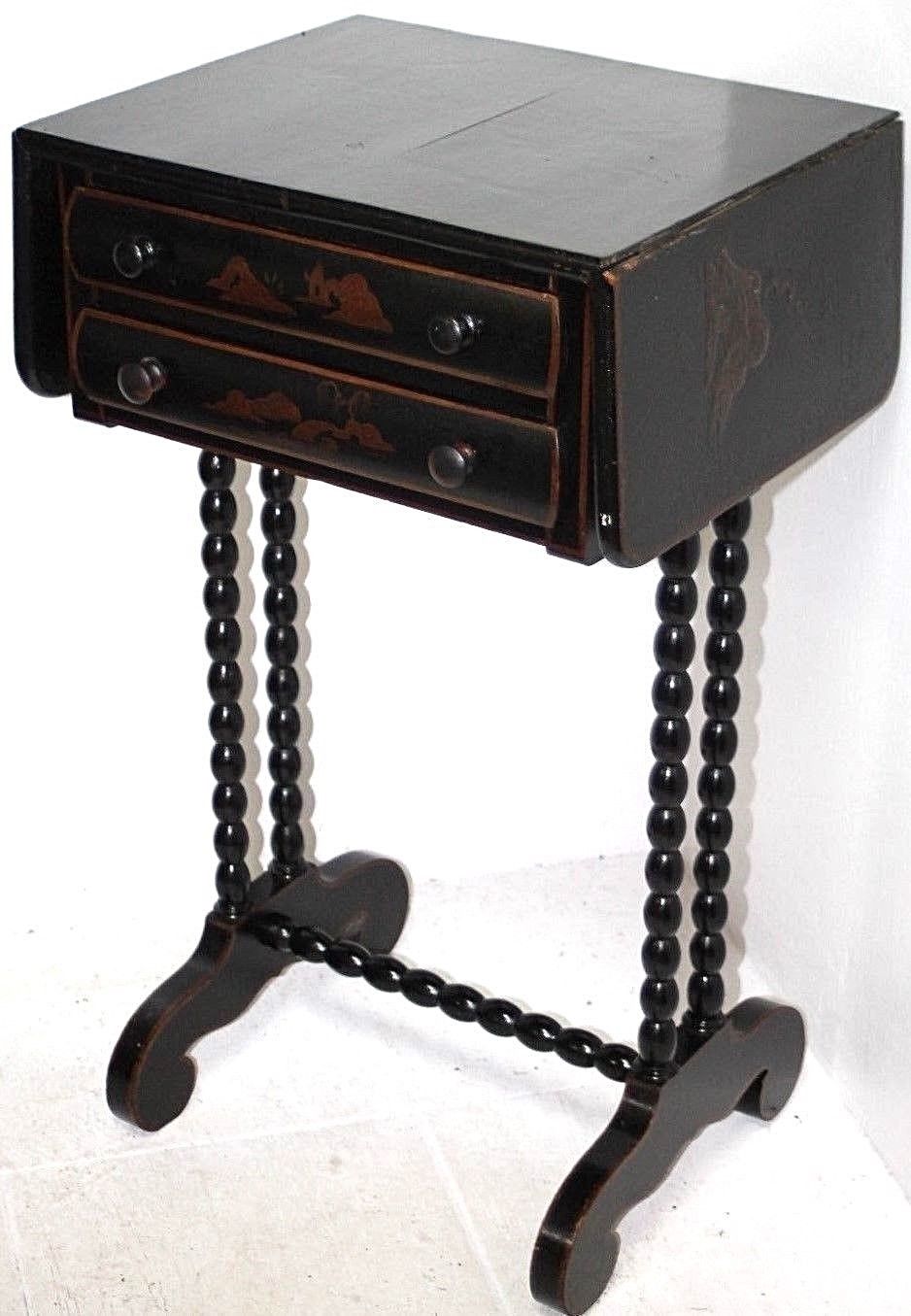 Title (ebay affiliate link): ANTIQUE 2 DRAWER LACQUERED DROP LEAF TABLE STAND W/ ORIENTAL SCENES & SPOOL LEGS