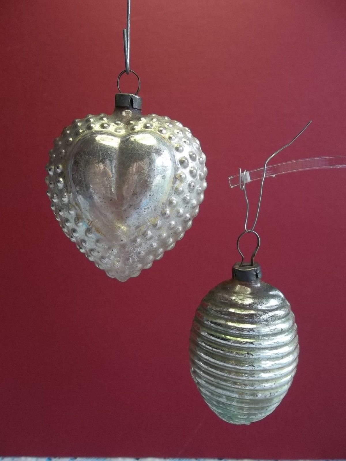 Title (ebay affiliate link): 2 VINTAGE ANTIQUE TINY MERCURY GLASS ORNAMENTS GERMANY FEATHER TREE HEART & ORB
