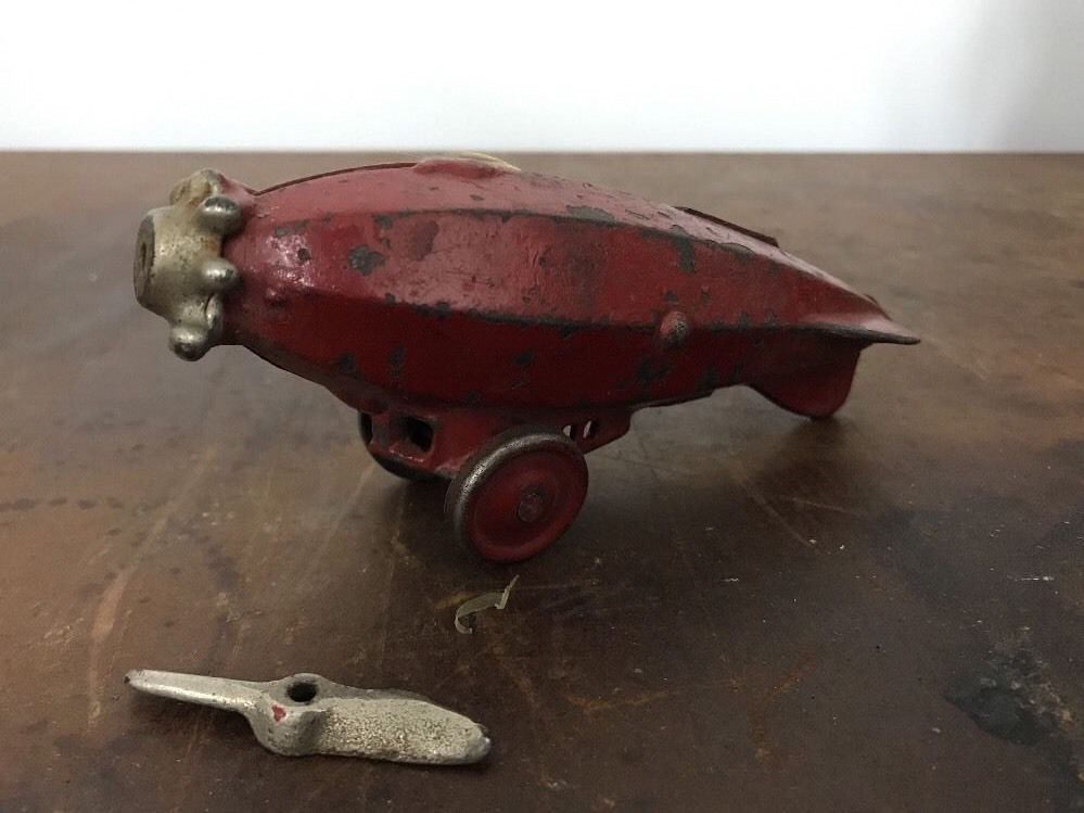 Title (ebay affiliate link): 1930s Cast Iron 6 inch Dent Blimp Pull Toy aka Zeppelin with Propeller