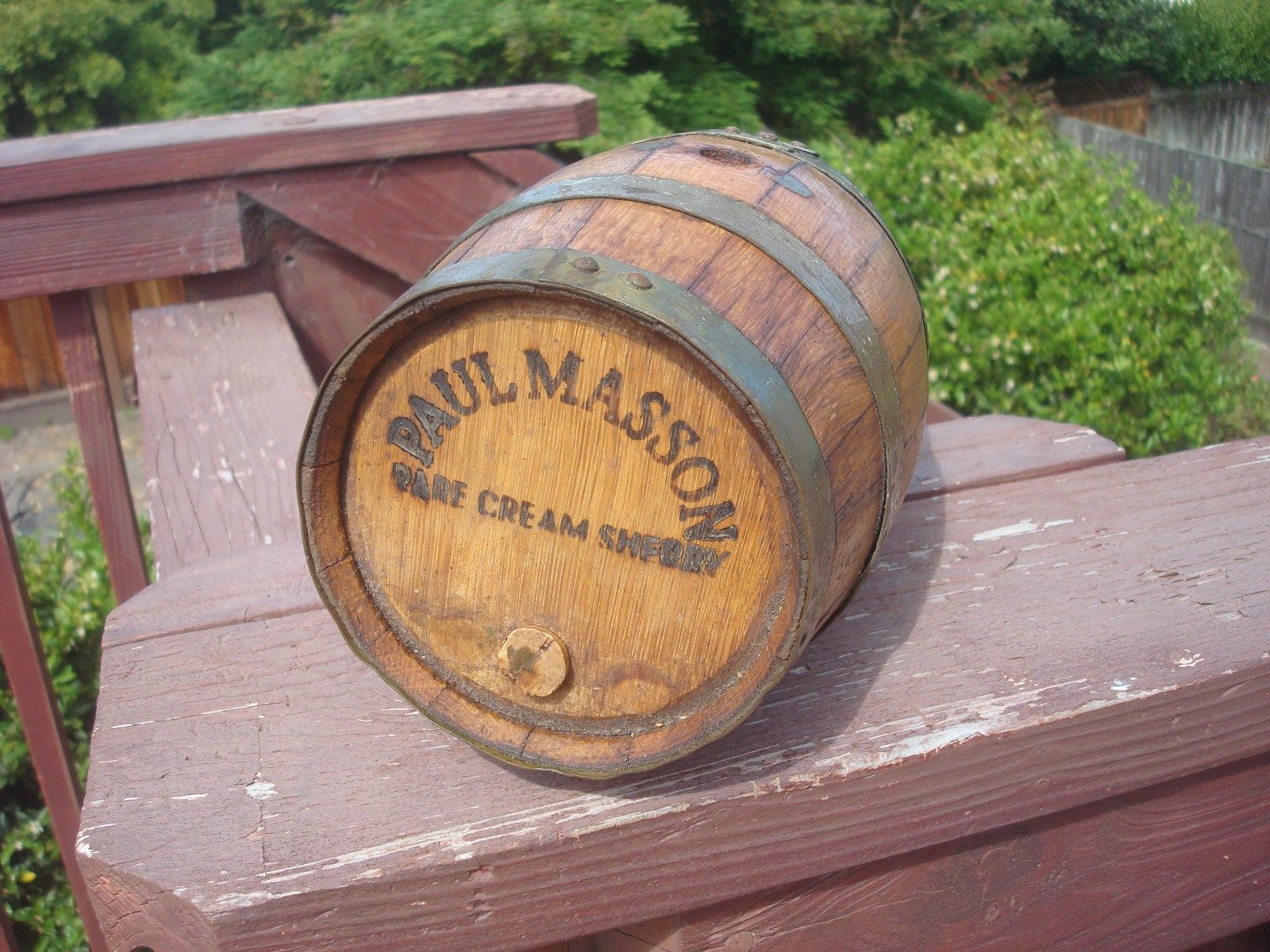 ANTIQUE VINTAGE SMALL WOODEN BANDED BARREL PAUL MASSON CAL RARE CREAM SHERRY