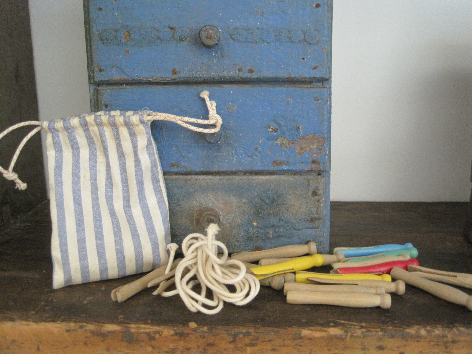 Title (ebay affiliate link): Old Primitive Blue White Fabric Drawstring Bag filled with Wood Doll Clothespins