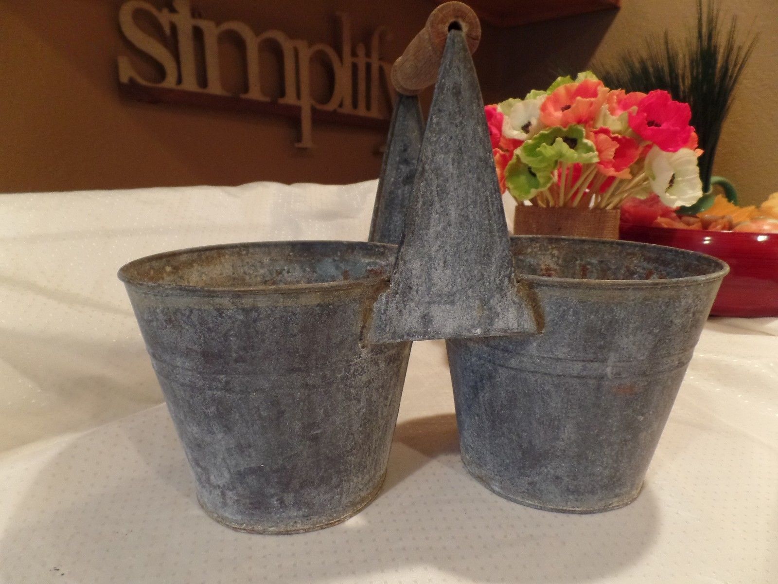 Vintage Galvanized Metal Wood Double Bucket Pail Planter Rustic Country Barn