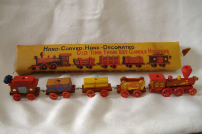 Title (ebay affiliate link): VINTAGE HAND-CARVED, OLD TIME TRAIN SET CANDLE HOLDERS