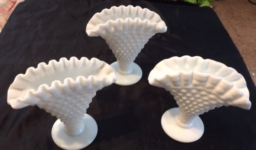 Title (ebay affiliate link): VTG LOT OLD FENTON ART WHITE MILK GLASS HOBNAIL FAN VASES 4"