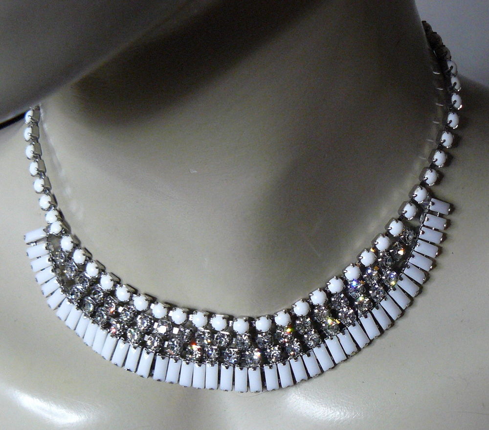Title (ebay affiliate link): STUNNING VTG DESIGNER QUALITY WHITE MILK GLASS BAGUETTE RHINESTONE BIB NECKLACE!