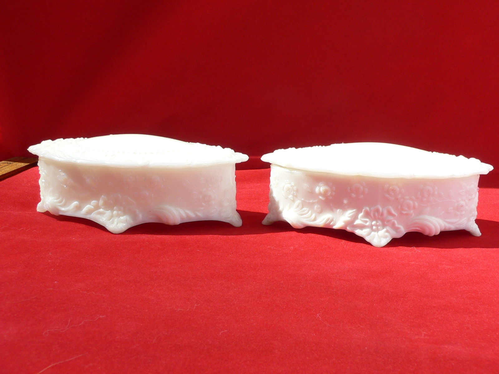 Pair of Butter Dish White Milk Glass w/ Cover Flowers