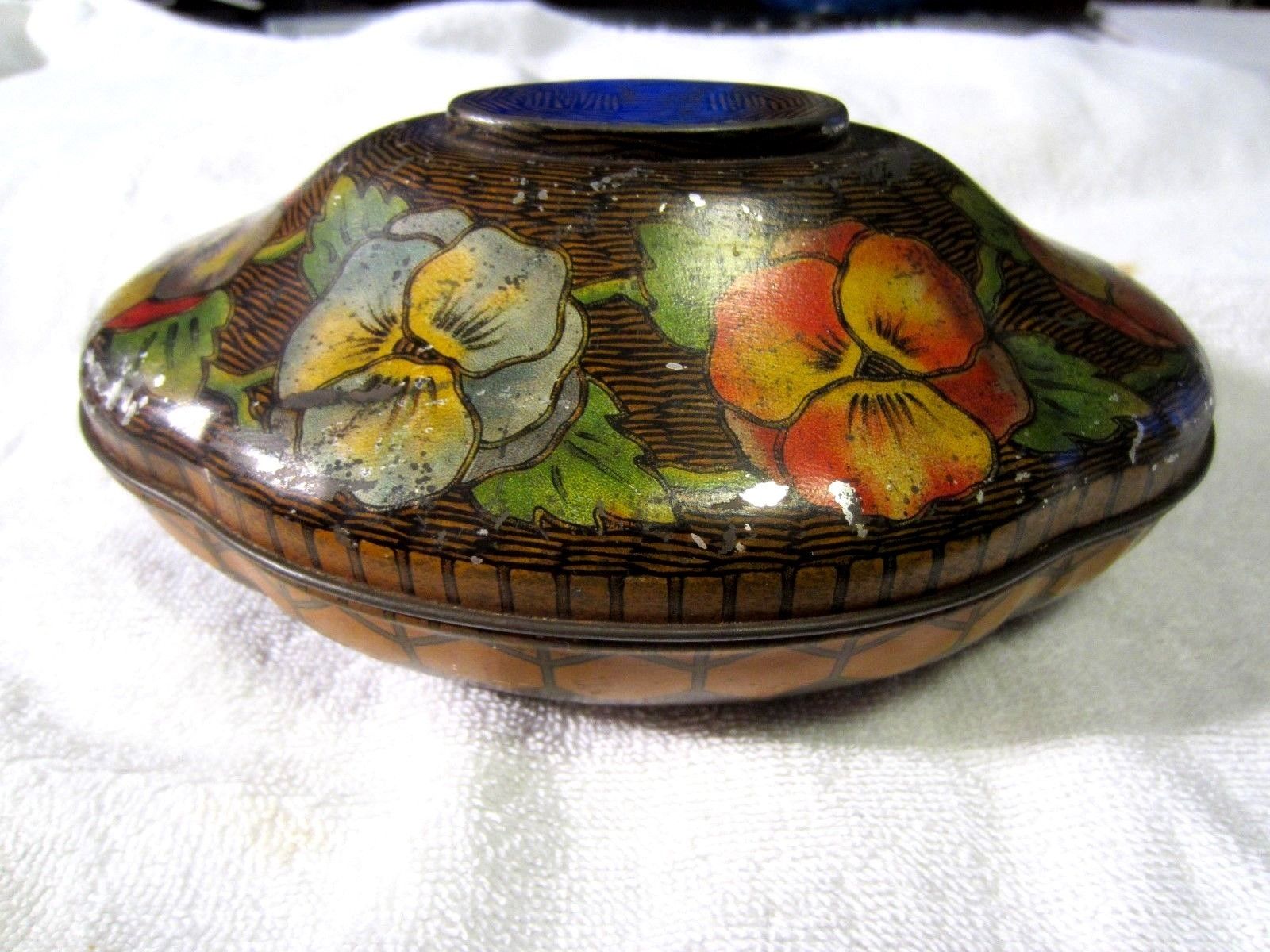 ANTIQUE ENGLISH FIGURAL TIN, ROUNDTREE CHOCOLATES, YORK ENGLAND . 1910 PANSIES