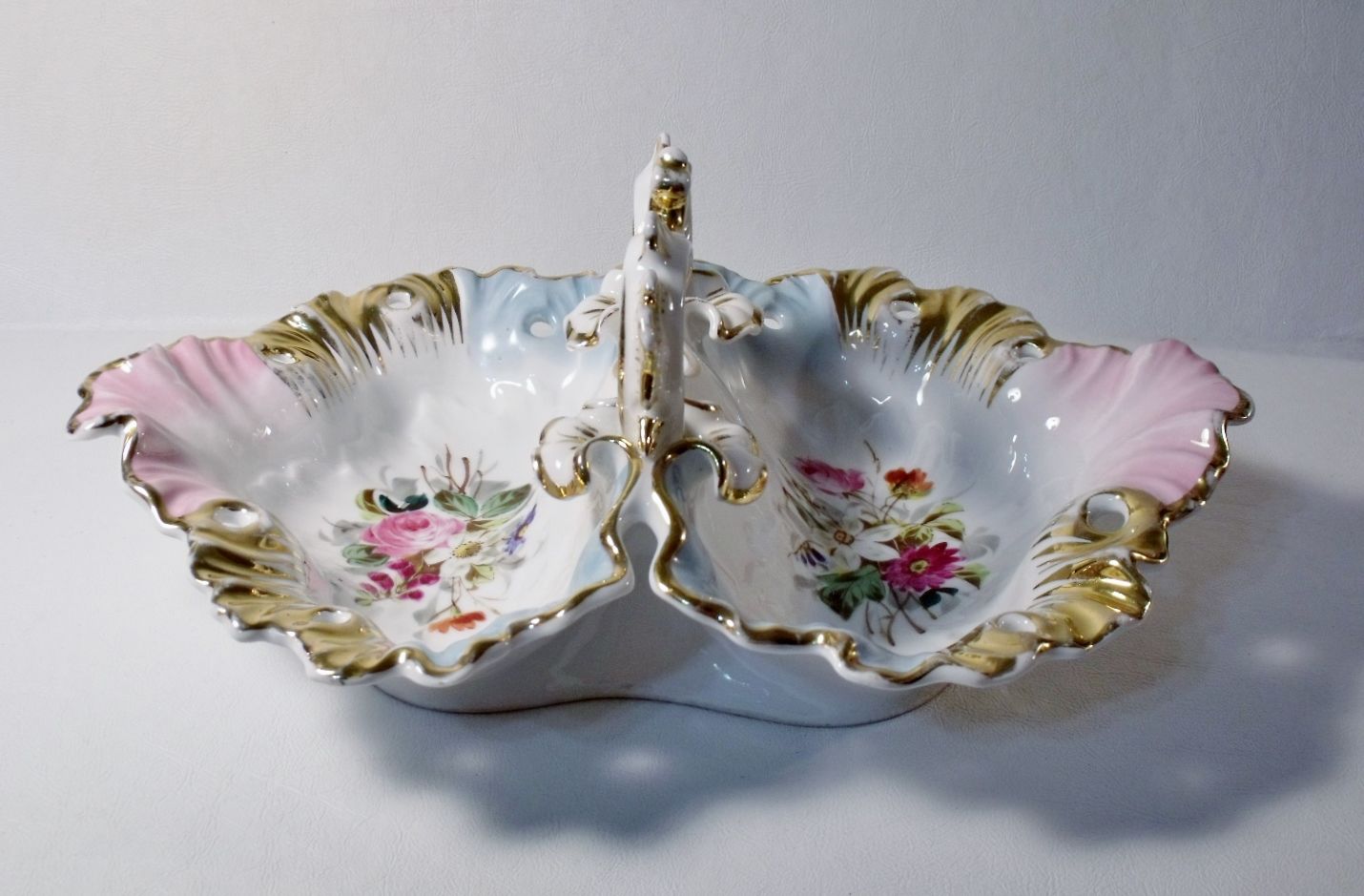 Antique Handled Porcelain Double Dish - Colorful Flowers, Gold Trim