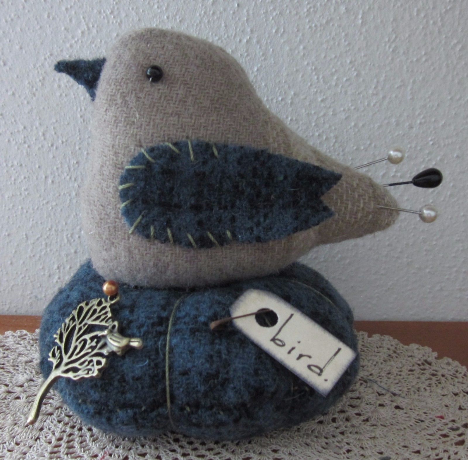 Title (ebay affiliate link): PRIMITIVE WOOL TAN BLUE CHARM BIRD MAKE DO PIN CUSHION PFATT