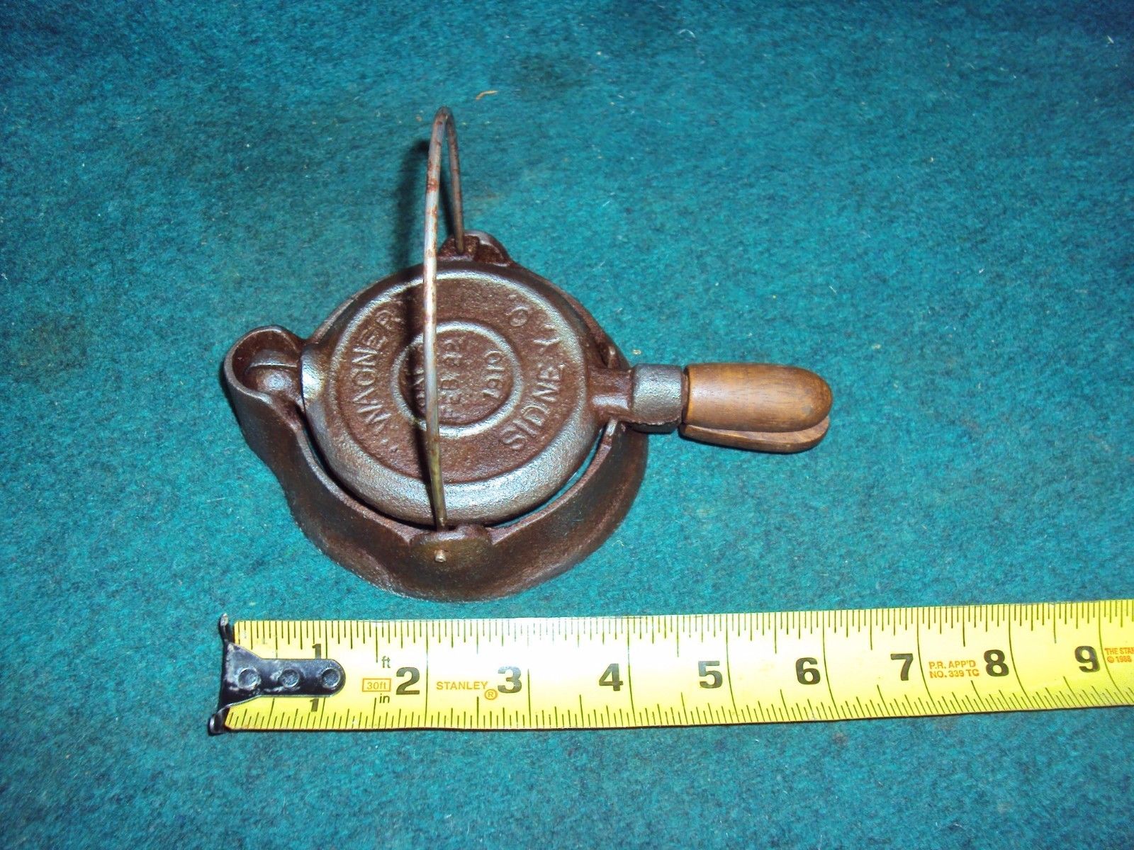 Title (ebay affiliate link): 1920s WAGNER Salesman SAMPLE Size CAST IRON 7" x 3" WAFFLE IRON + Base