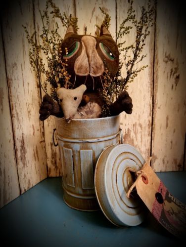 Primitive Black Cat & Mouse Doll in metal Trash Can~*~ Kitty~*~ Make-do~*~